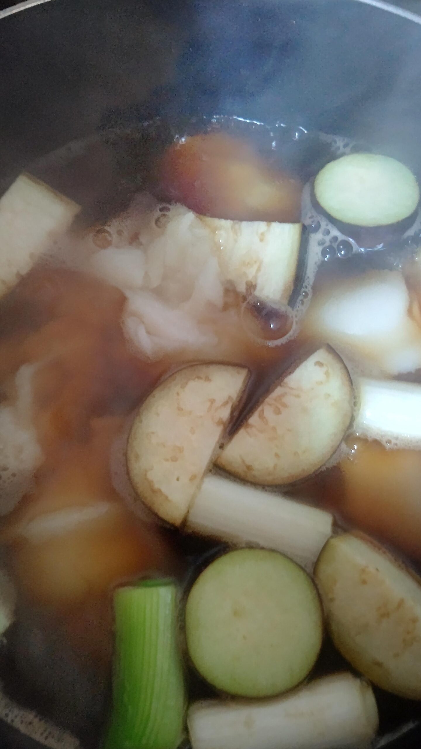 鍋でナスとネギ煮る