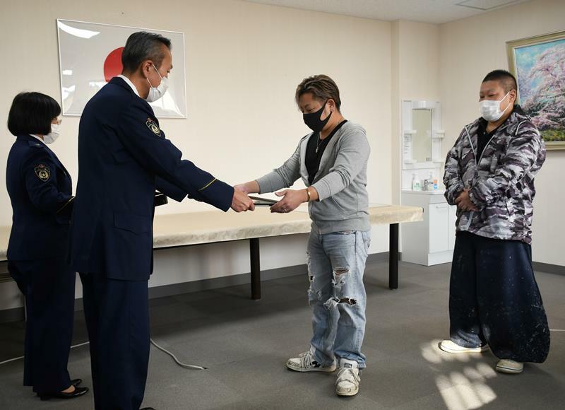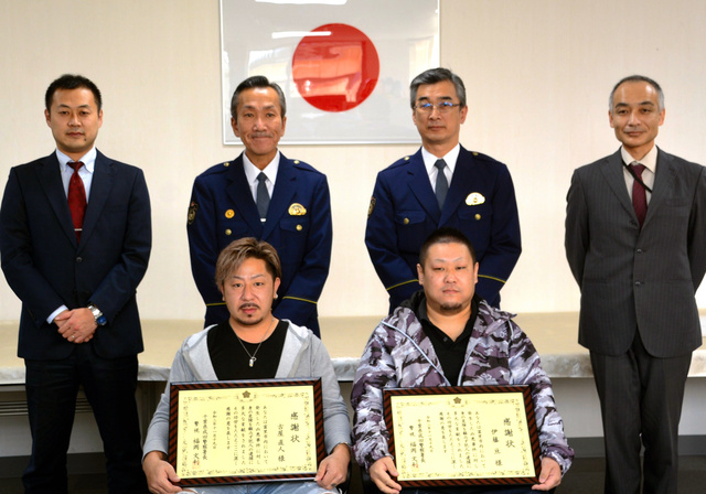 贈呈式で福岡文利署長は「正義感あふれる2人の行動によって、命が失われずに済んだ。事件解決に大変顕著な貢献をしていただいた」と感謝した。
